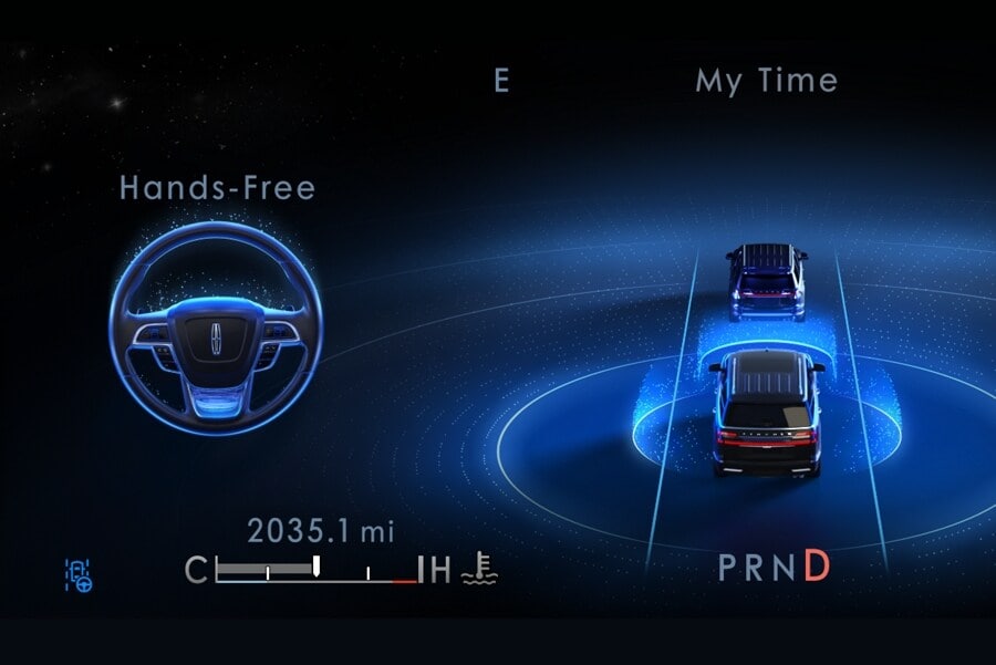 When activated, a mode indicator located within the display cluster will show a graphic of a steering wheel with the text "Hands-Free." A blue background hue appears when it is safe to remove your hands from the steering wheel, then indicates when you need to put your hands back on the steering wheel to take control. This indicator helps provide a clear notification for when Lincoln BlueCruise is engaged.